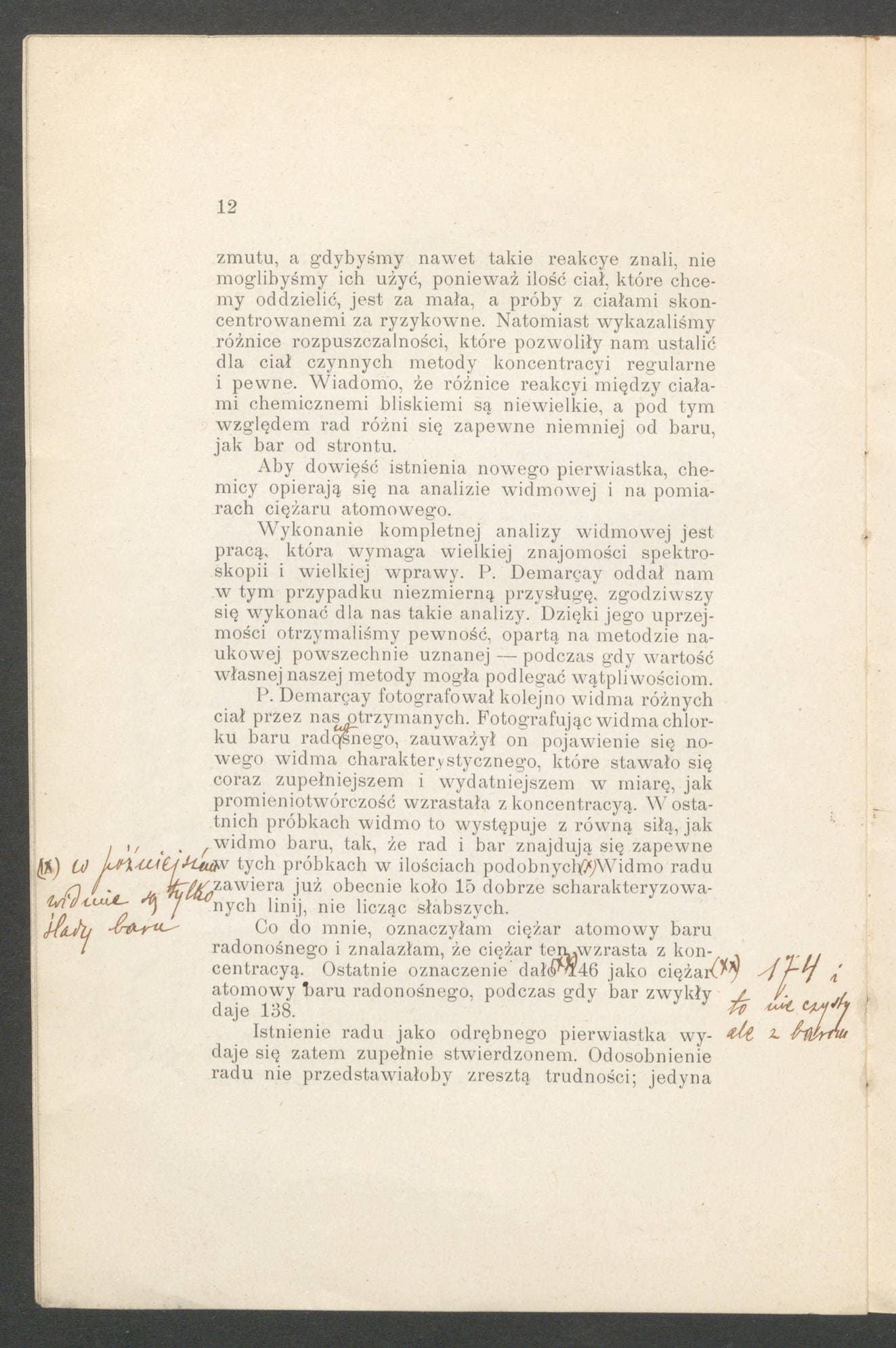 In the second, after the printed sentence “W ostatnich próbkach widmo to występuje z równą siłą, jak widmo baru, tak, że rad i bar znajdują się zapewne w tych próbkach w ilościach podobnych,” she writes “(x) W późniejszem widmie są tylko ślady baru.” Translated, the printed sentence reads “In the most recent samples, the spectrum occurs with the same strength as the spectrum of barium, so radium and barium are most probably present in these samples in similar quantities.” Curie’s translated comment reads “In a later spectrum there are only traces of barium.”