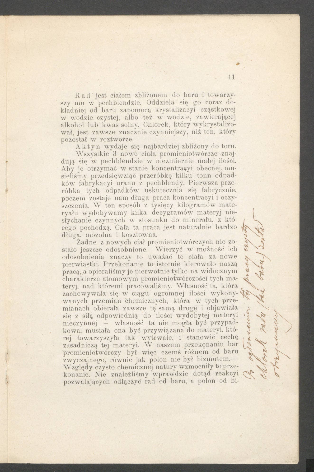 On page 11, Curie writes “Po ogłoszeniu tej pracy czysty chlorek radu (bez baru) został otrzymany” which translates to “After the publication of this work, pure radium chloride (without barium) was obtained.” This references the first sentence of the third paragraph on the page, starting with the word “Zadne.” The translated printed sentence reads “None of the new radioactive substances have yet been isolated.” It is this correction that allows us to date the comments after 1902, as Curie did not isolate radium chloride until that year.