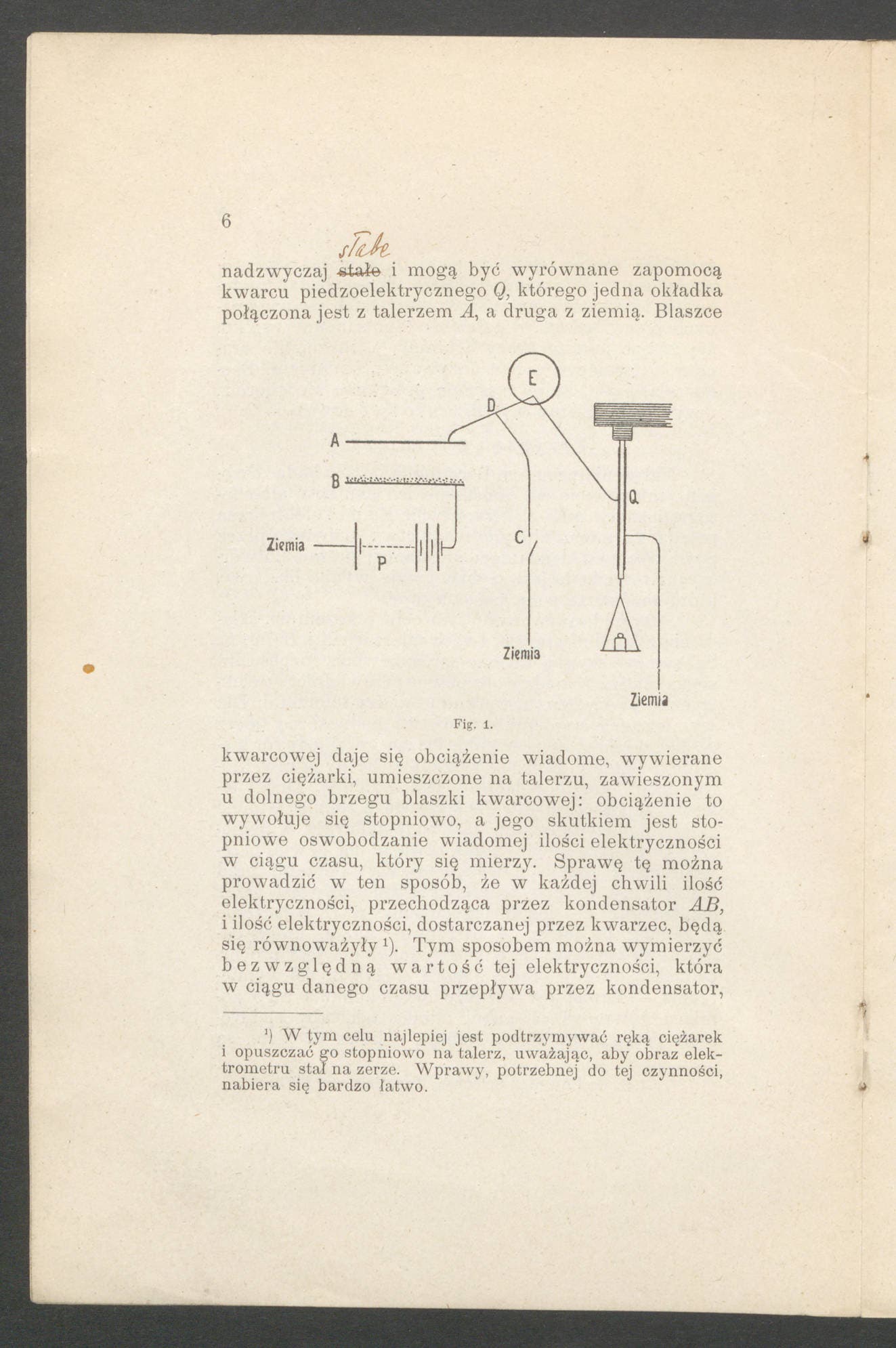 On page 6, Curie has crossed out the word “stałe” (tr:constant) and replaced it with “słabe” (tr: weak), making the updated translated sentence read “These cartridges/charges are extremely constant [corrected to: weak] and can be levelled by using piezoelectric quartz Q, of which one cover is connected with the plate A and the other with the ground.