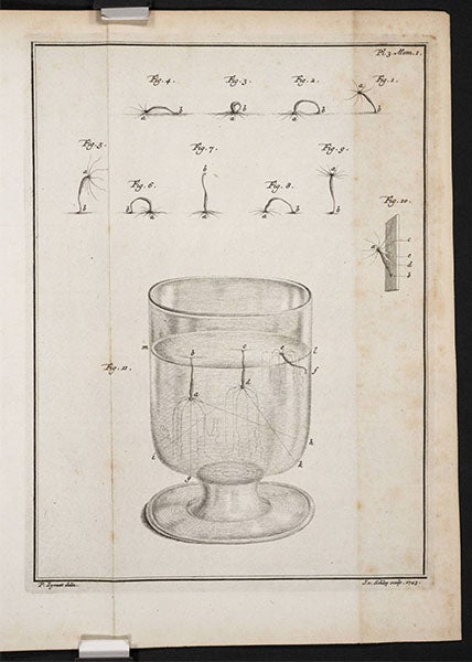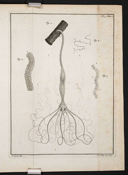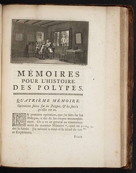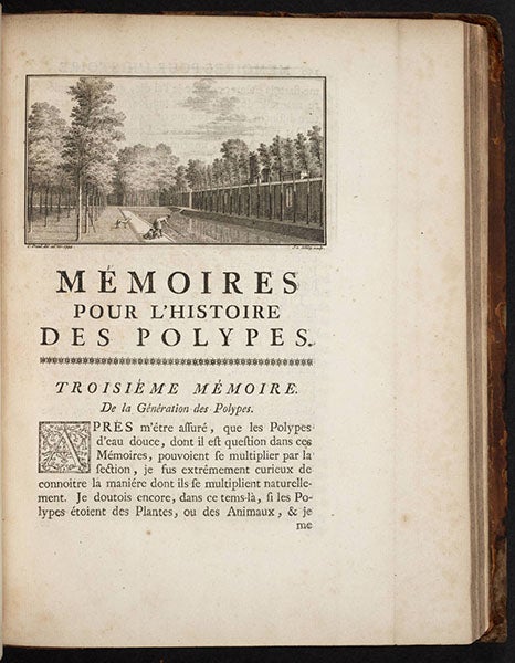 We have Trembley’s Memoires in our History of Science collection. The first two images above, showing a jar of hydra, and a single organism, are from this book. Trembley also incorporated small engraved scenes as headpieces to the separate memoirs in the book; one shows hydra being fished from a pond, and the other depicts Trembley in his lab, showing his specimens to some children (fourth and fifth images).