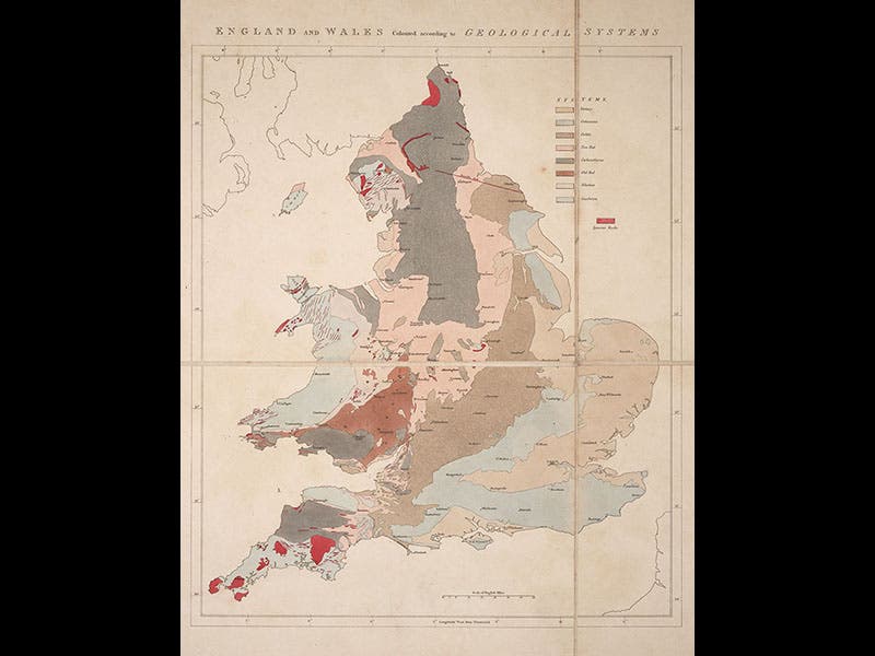 Adam Sedgwick, an English geologist, was born Mar. 22, 1785. In 1831, Sedgwick and an older colleague, Roderick Murchison, decided to investigate the geological formations of Wales, hoping to discover systems that underlay the Old Red Sandstone of western England, which was the oldest rock formation known to English geologists. Both were successful; Sedgwick went to northern Wales and discovered the Cambrian system (announced in 1835), while Murchison toured southern Wales and found a different system of underlying rocks, which he called the Silurian system. The Cambrian system seemed to be the older system, with more primitive fossils than the Silurian. On the geological map of England above (second image), we see at the very left the light blue color of the Cambrian and the pink beige of the Silurian, indicated by the legend that accompanies the map (third image). The map above is a detail of a much larger map that accompanies Murchison’s monograph, The Silurian System (1839), which we have in our History of Science Collection.