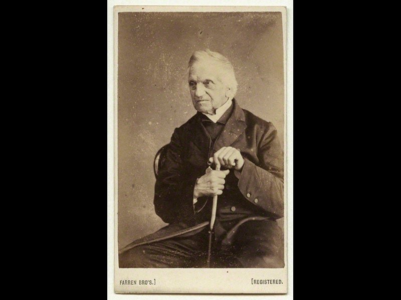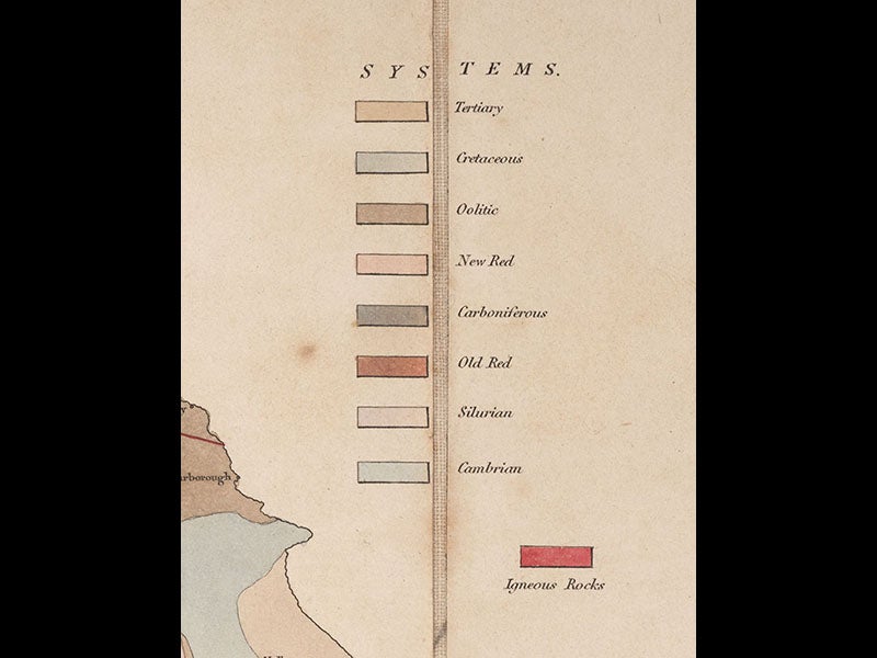 Adam Sedgwick, an English geologist, was born Mar. 22, 1785. In 1831, Sedgwick and an older colleague, Roderick Murchison, decided to investigate the geological formations of Wales, hoping to discover systems that underlay the Old Red Sandstone of western England, which was the oldest rock formation known to English geologists. Both were successful; Sedgwick went to northern Wales and discovered the Cambrian system (announced in 1835), while Murchison toured southern Wales and found a different system of underlying rocks, which he called the Silurian system. The Cambrian system seemed to be the older system, with more primitive fossils than the Silurian. On the geological map of England above (second image), we see at the very left the light blue color of the Cambrian and the pink beige of the Silurian, indicated by the legend that accompanies the map (third image). The map above is a detail of a much larger map that accompanies Murchison’s monograph, The Silurian System (1839), which we have in our History of Science Collection.