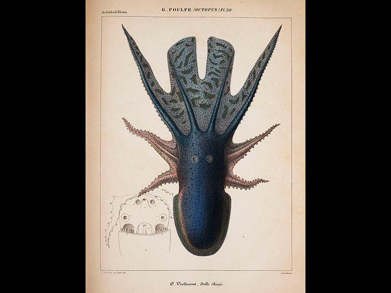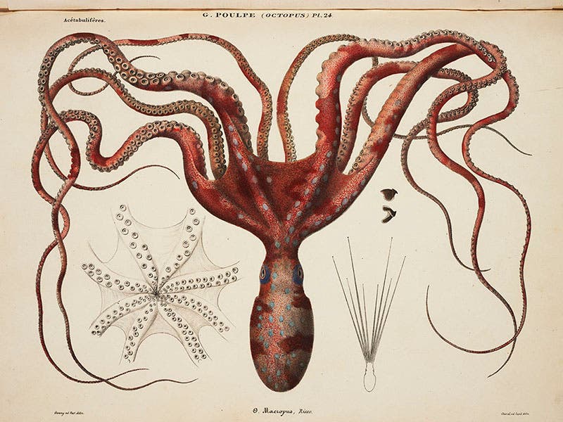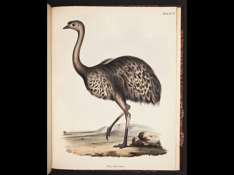Alcide d'Orbigny, a French naturalist, died June 30, 1857 at age 54. In 1826, the Paris Museum of Natural History sent Orbigny to South America to collect specimens, which he did with enthusiasm until 1833, sending back thousands of items. Darwin encountered Orbigny’s shadow in 1832 when he arrived at the Rio Negro in Patagonia on the Beagle voyage and learned that Orbigny had been there for the previous six months and had just sailed around the Horn. In a letter back home to his mentor John Henslow, Darwin grumbled that Orbigny had probably collected all the good stuff. A little later, Darwin found the partial remains of a new species of Rhea, smaller than the common variety (Darwin actually collected his specimen from a stew pot, where the cook had been preparing it for dinner). Darwin's colleague John Gould later named it Rhea darwinii. Unbeknownst to Gould or Darwin, Orbigny had beaten him to the punch here as well, collecting a specimen ahead of Darwin and naming it Rhea pinnata before Gould published his name. So the term "Darwin's rhea" is now only a colloquial term, with no scientific validity. There is a wonderful lithograph by Elizabeth Gould of Rhea darwinii as it appeared in Darwin’s Zoology of the Beagle, when the name was still valid (see first image above). Orbigny published an account of his South America adventures, Voyage dans l’Amérique méridionale (1835-47), which we do not have at the Library. But we do have a splendid edition of his Natural History of Cephalopods [!octopi!], with handsome colored engravings of your favorite squid. We included this work in our 2013 exhibition, Crayon and Stone; the image we displayed, plus a bonus, can be seen above (third and fourth images). Dr. William B. Ashworth, Jr., Consultant for the History of Science, Linda Hall Library and Associate Professor, Department of History, University of Missouri-Kansas City. Comments or corrections are welcome; please direct to ashworthw@umkc.edu.