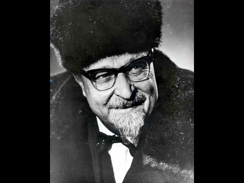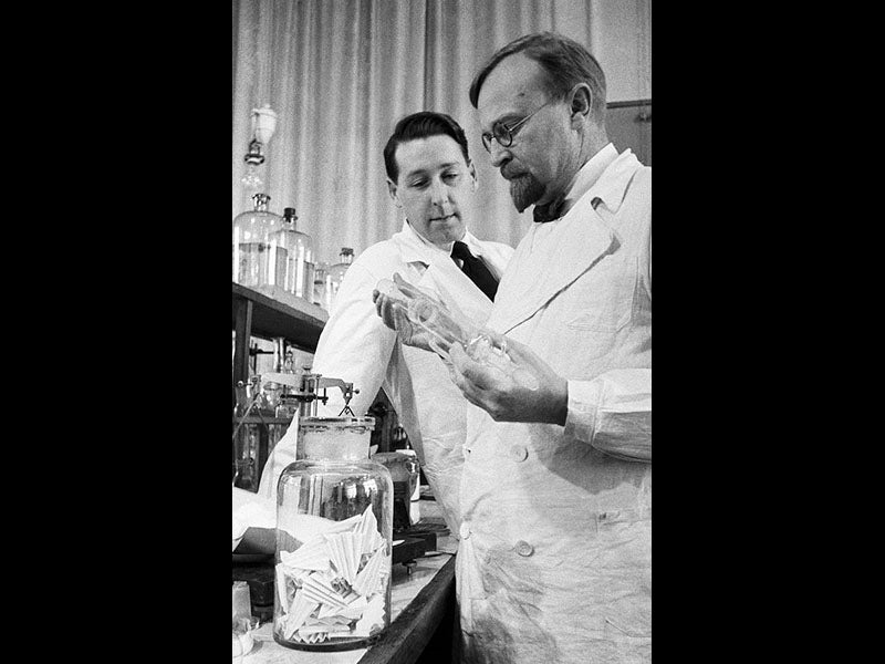 Oparin’s paper of 1924 was not translated into English until 1967. But in 1936, he wrote a larger book that did appear, in English translation, in 1938, called The Origin of Life. The colorful dust jack appears to have been designed by Rockwell Kent (first image). Oparin lived long enough (to age 86) to become very well-known and well photographed; two of our favorites show him in the lab (second image), and at leisure (third image).
