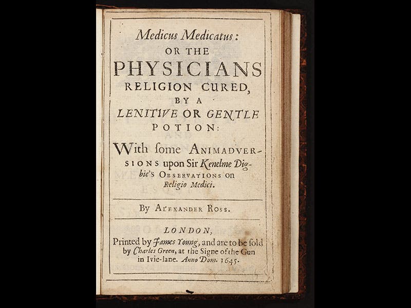 Alexander Ross, a Scottish writer, was born on some unknown day, perhaps in 1590, perhaps not (see his portrait, second image). One of the few certain dates we have for Ross is Sep. 13, 1633, when he wrote and dated the dedication of his first book, a critique of Copernicanism. So we use this date as the occasion for a Ross anniversary. Ross was a professional curmudgeon. Other people had new ideas and wrote books; Ross had old ideas and loved to critique any books that offered up new ones. But Ross had one real knack: he knew how to compose catchy (and lengthy) titles for his critiques. One of his books, for example, was called: Arcana microcosmi: or, The hid secrets of man's body discovered, in an anatomical duel between Aristotle and Galen... With a refutation of Doctor Browns Vulgar errors, and the Lord Bacon's Natural history, and Doctor Harvy's book, De generatione, Comenius, and others (1652; first image). This book, and two others by Ross that are equally querulous, repose in our History of Science Collection (third and fourth images). But we do not have this next book, in spite of our best efforts to acquire it. It has the wonderful title: The New Planet No Planet: or, The Earth no wandring Star: Except in the wandring heads of Galileans (1646).