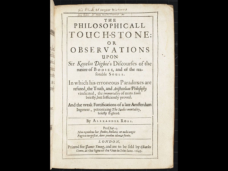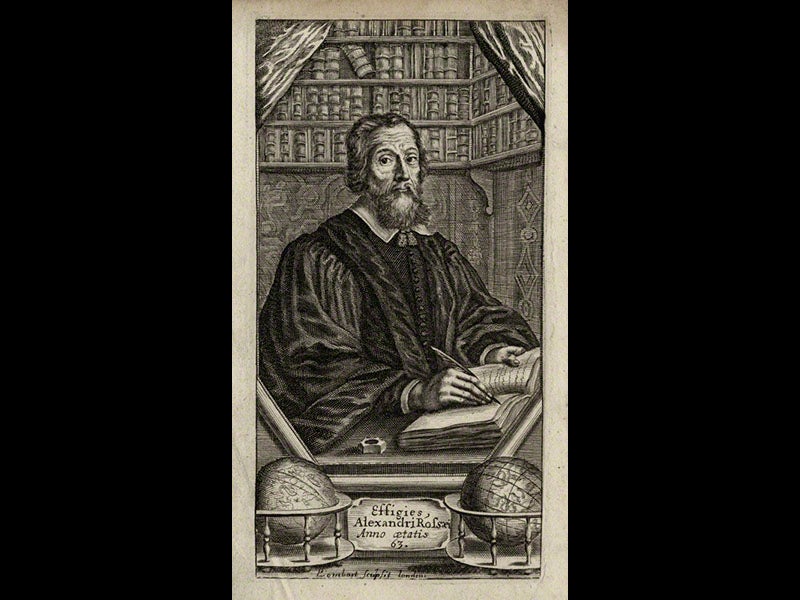 Alexander Ross, a Scottish writer, was born on some unknown day, perhaps in 1590, perhaps not (see his portrait, second image). One of the few certain dates we have for Ross is Sep. 13, 1633, when he wrote and dated the dedication of his first book, a critique of Copernicanism. So we use this date as the occasion for a Ross anniversary. Ross was a professional curmudgeon. Other people had new ideas and wrote books; Ross had old ideas and loved to critique any books that offered up new ones. But Ross had one real knack: he knew how to compose catchy (and lengthy) titles for his critiques. One of his books, for example, was called: Arcana microcosmi: or, The hid secrets of man's body discovered, in an anatomical duel between Aristotle and Galen... With a refutation of Doctor Browns Vulgar errors, and the Lord Bacon's Natural history, and Doctor Harvy's book, De generatione, Comenius, and others (1652; first image). This book, and two others by Ross that are equally querulous, repose in our History of Science Collection (third and fourth images). But we do not have this next book, in spite of our best efforts to acquire it. It has the wonderful title: The New Planet No Planet: or, The Earth no wandring Star: Except in the wandring heads of Galileans (1646).