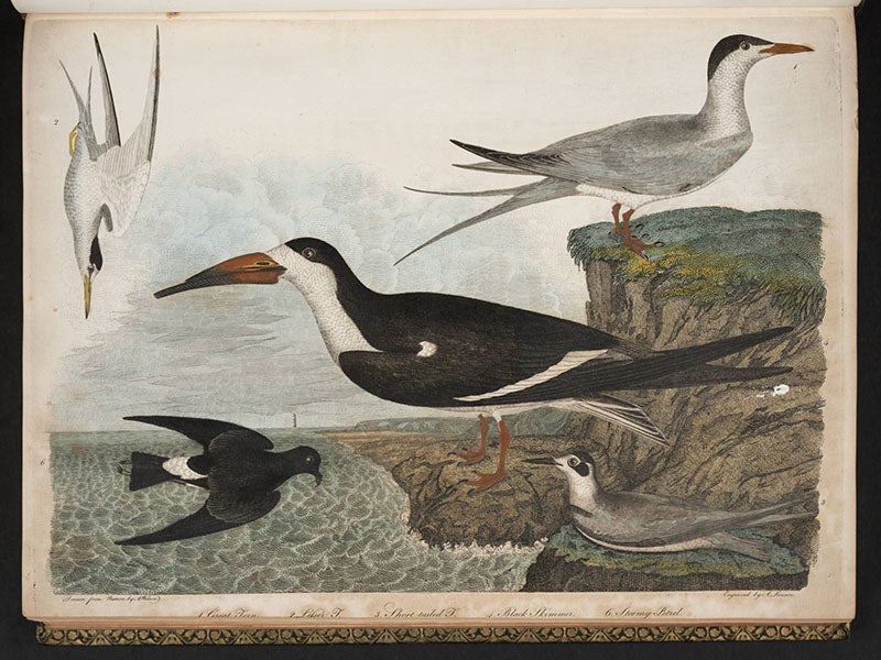 The first five images above are all taken from the American Ornithology and depict, among others, the great heron (first image), a black skimmer (second image), the now-extinct Carolina parakeet (third image), a painted bunting (fourth image), and two birds named after William Clark and Meriwether Lewis (fifth image). The last image shows a statue of Wilson, erected outside of Paisley Abbey in his native Scotland.