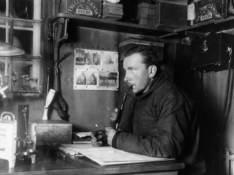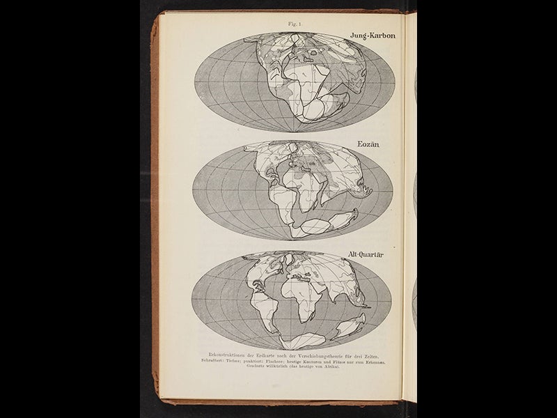 We have Wegener's seminal papers, the first three German editions of his book, the English translation of 1924, and the proceedings of the 1926 Symposium, in our History of Science Collections. The plate showing Pangaea and its breakup (first and second images), was taken from the 1922 edition, which for some reason we have digitized. The fourth image shows him in 1912, at the age of 32, taken on a previous expedition to Greenland.