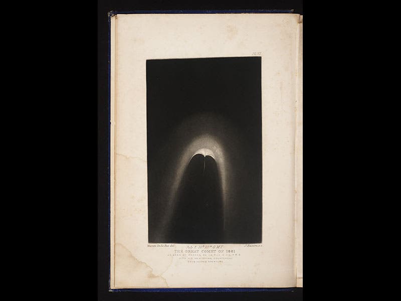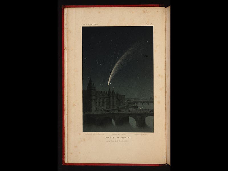 Amédée Guillemin, a French science writer, was born July 5, 1826. Guillemin wrote a number of books on astronomy intended for the general public, such as Le ciel (1866), La lune (1868), and Le soleil (1873). The books were so popular in France that British publishers took notice, and nearly all of Guillemin's books appeared almost immediately in English translation. Above we reproduce images from Les cometes (1875) and its English version, The World of Comets (1877), and one can see at once why Guillemin's books were so appealing, with their wood engravings and handsome colored lithographs. The first three images are from the French edition and depict, in order, Donati's comet over Paris in 1858; the Great comet of 1843; and Cheseaux's comet of 1744. The next three images shows the cover of the English edition, with Donati's comet stamped in gold on the blue cloth; Cheseaux’s comet again, in its English version; and a beautiful mezzotint that does not appear in the French edition, depicting the Great comet of 1861.