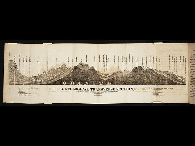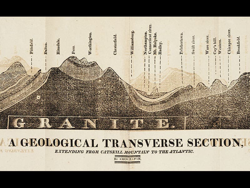 Amos Eaton, an American geologist, was born May 17, 1776. Eaton was a co-founder (with Stephen van Rensselaer) of Rensselaer Polytechnic Institute in Troy, New York, and he taught there until his death in 1842. In 1818, Eaton published An Index to the Geology of the Northern States (third image), which contains a large folding geological section, showing the rock formations from Boston to the Hudson River (first image). It is, we believe, the first geological section of any part of North America. One of the prominent features of this woodcut is the word "Granite" spelled out in large letters at the bottom, indicating the bedrock below most of New England (second image).