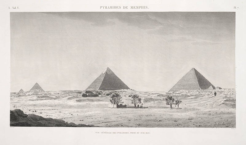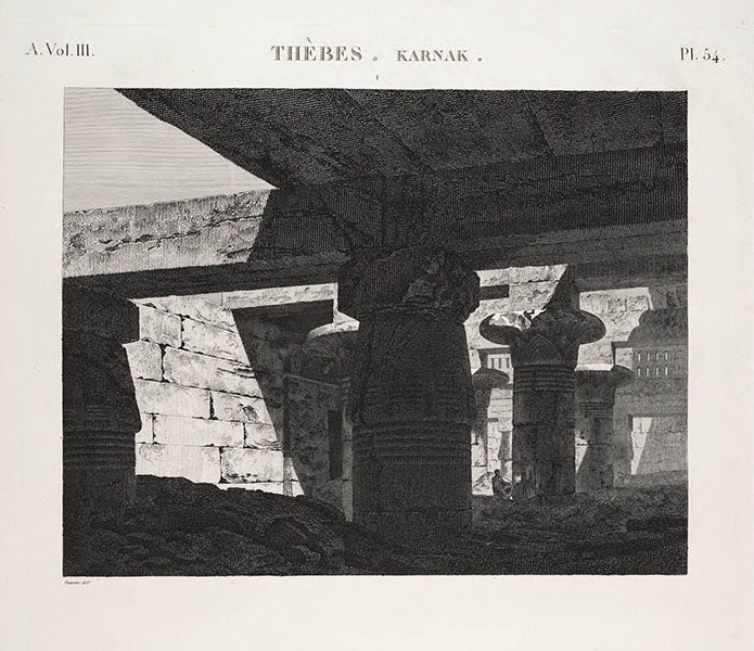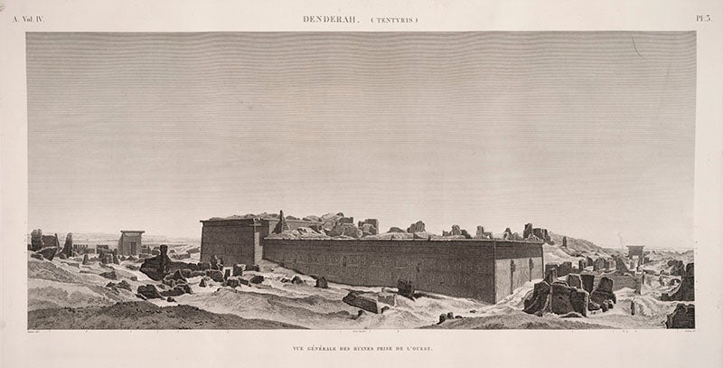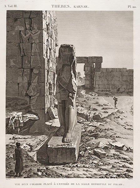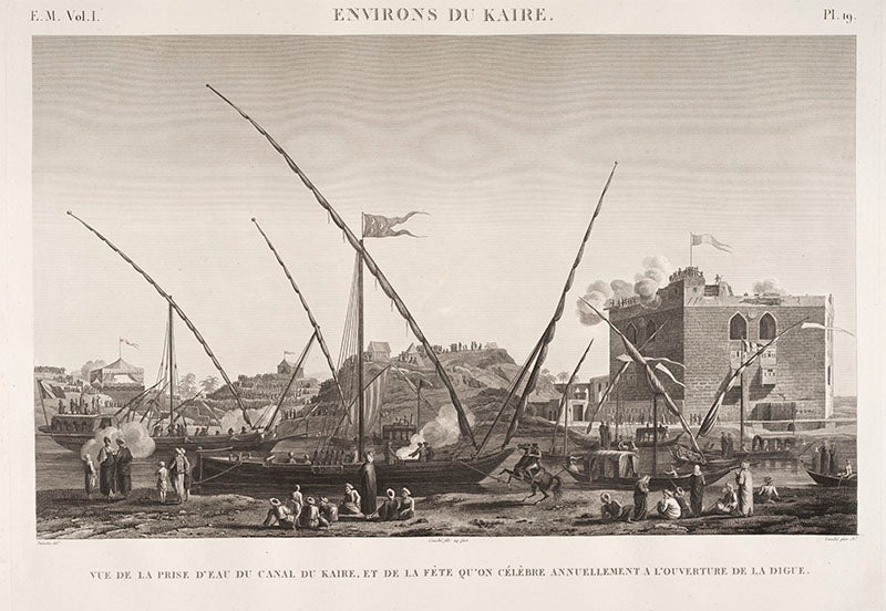 André Dutertre, a French artist, was born June 9, 1753. Dutertre accompanied Napoleon Bonaparte on his invasion of Egypt in 1798. He was supposed to be sketching irrigation machinery, glass-making factories, and canal boats (which he did, to some extent, see fifth image), but when he and the scientific corps discovered the antiquities of Egypt, there was no holding them back. Many of the engravings in the Description de l’Egypte (1809-28) were based on Dutertre drawings, such as the plates depicting the pyramids at Giza (first image), the sand-filled interior of the temple at Karnak (second image), the temple at Dendera, where the stone zodiac was found (third image), and a ruined colossus at Karnak (fourth image)--note the artist contemplating the statue, perhaps Dutertre placing himself within the scene.