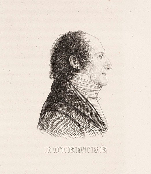 Dutertre distinguished himself from the other expedition artists by taking on the task of making pencil sketches of every scientist and engineer who accompanied Napoleon to Egypt. One of the webpages of our exhibition, Napoleon and the Scientific Expedition to Egypt (2006) [link to: http://napoleon.lindahall.org/gallery.shtml ] presents an engraving of the first meeting of the Institute of Egypt, and we invite the viewer to compare the figures depicted in the scene with portrait sketches of the expedition members arranged below. All but one of those sketches were drawn by Dutertre; they were later printed in Marie Reybaud's ten-volume Histoire de l'expedition francaise en Egypte (1830-36), which we also have in our collection. The self-portrait of Dutertre (sixth image) is from this work.