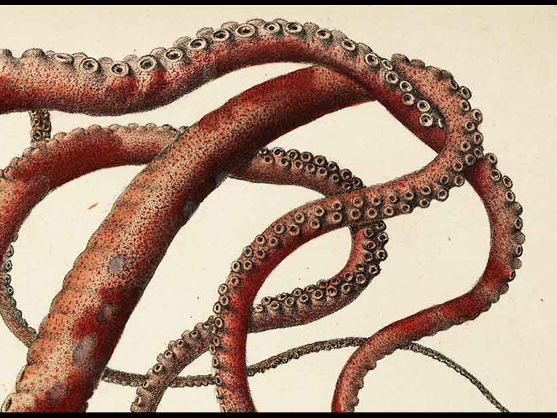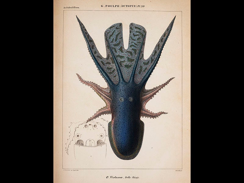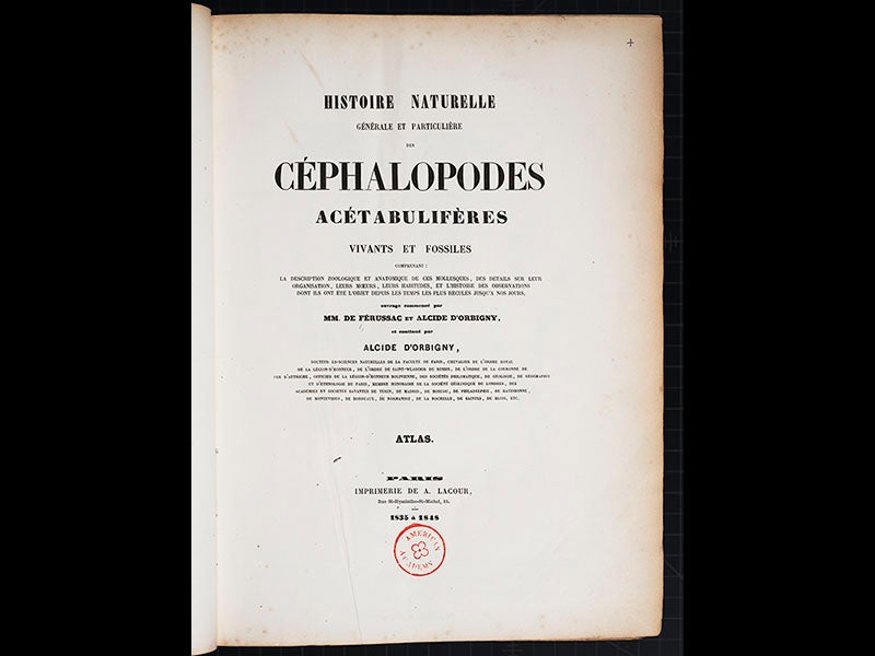 André-Etienne de Ferussac, a French naturalist, was born Dec. 30, 1786. Ferussac seems to have inherited an interest in mollusks from his father, if such a thing is possible, and he himself developed a special fondness for squid and their octopi relatives. He began work on a comprehensive study of cephalopods in 1822, and publication started in 1835, but Ferussac died while the work was in progress, and it was completed by Alcide d’Orbigny, another great French naturalist who had collected extensively in South America, with the final part appearing in 1848. Histoire naturelle, générale et particuličre des céphalopodes contains gorgeous colored lithographs of a wide variety of cephalopods. We see a selection above, as well as the title page, and a detail of one of the plates.
