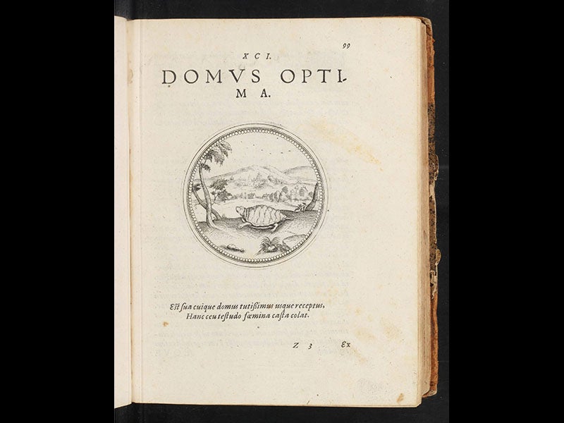 Natural history writers, such as Conrad Gessner, took a great interest in emblem literature, and in his Historia animalium (1551-58), Gessner cited Alciato frequently. This interest fed back into the emblem-writing community, so that by 1590, Joachim Camerarius began issuing an entire 4-volume emblem work that contained nothing but natural history emblems--400 of them in all. We will try to remember to feature Camerarius in this space on his birthday next Nov. 6, since we own a copy of his Symbolorum & Emblematum ex Animalibus (1605), the only emblem book in our collection. We show one of his emblems above, a tortoise, with the motto “domus optima”—“the best house” (fourth image). Ulisse Aldrovandi, in turn, cited every single relevant Camerarius emblem in his 13-volume natural history which began publication in 1599. Gesner's and Aldrovandi's great interest in emblematic and adagial lore has led to this period being identified as the age of "emblematic natural history."