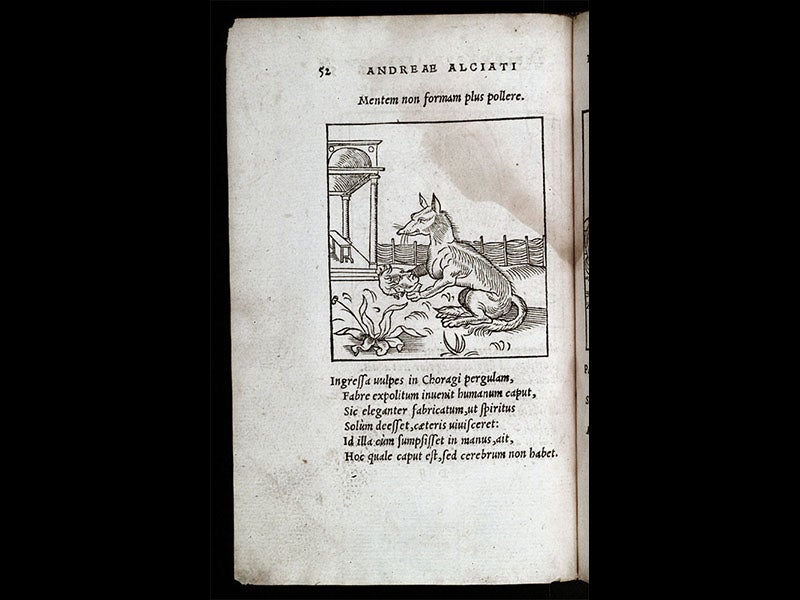 Andrea Alciato, an Italian lawyer, was born May 8, 1492. Often referred to as Alciati in earlier literature, Alciato created a whole new literary genre in 1531 by inventing the emblem and publishing the first emblem book. An emblem, as Alciato conceived of it, consisted of three elements: an image, a pithy motto, and a short explanatory verse. In the first example above, we see a woodcut of what is identified as a chameleon, beneath a motto, "in adulatores"--"flatterers"--and a text that explains that a chameleon represents a flattering sycophant, because it changes its color to suit its surroundings. Another Alciato emblem (second image) depicts a fox looking at a theatrical mask, with the motto: "mentem non formam plus pollere"--"a mind is better than a pretty face." Only a few of Alciato's emblems depict natural objects like animals and plants, but we focus on them here, because we are interested in Alciato's impact on natural history.