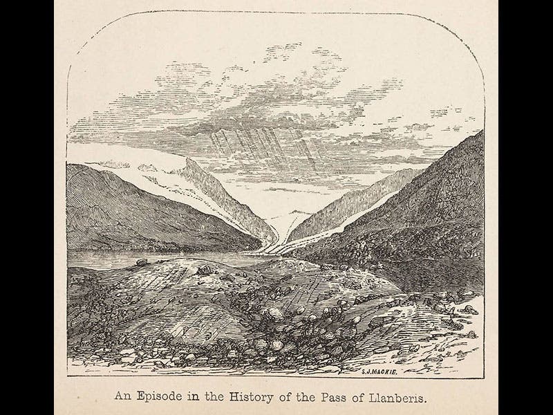 Ramsay also included two illustrations showing the pass of Llanberis, an ancient glacial pathway in Wales, first as it appears today (third image), and second, as it must have looked when it was filled by a glacier (fourth image). We included both images in our 2008 exhibition, Ice, a Victorian Romance.