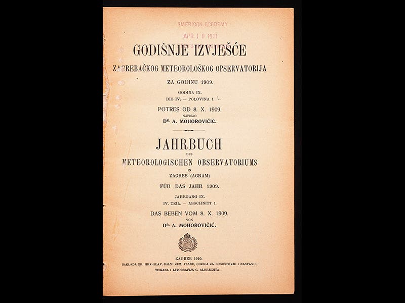 His paper was published in the Godiesnj Izvjesce (Yearbook) of the Meteorological Observatory of Zagreb in 1910 (see second image above). We have this issue in our serials collection; Mohorovičić’s paper is printed first in Croatian (I assume it is Croatian) and then again in German (that I am sure of). The paper has been cited thousands of times in the seismological literature, but I wonder how many of those who cite it have ever seen it, because it is quite scarce in the States. We are fortunate to have it.