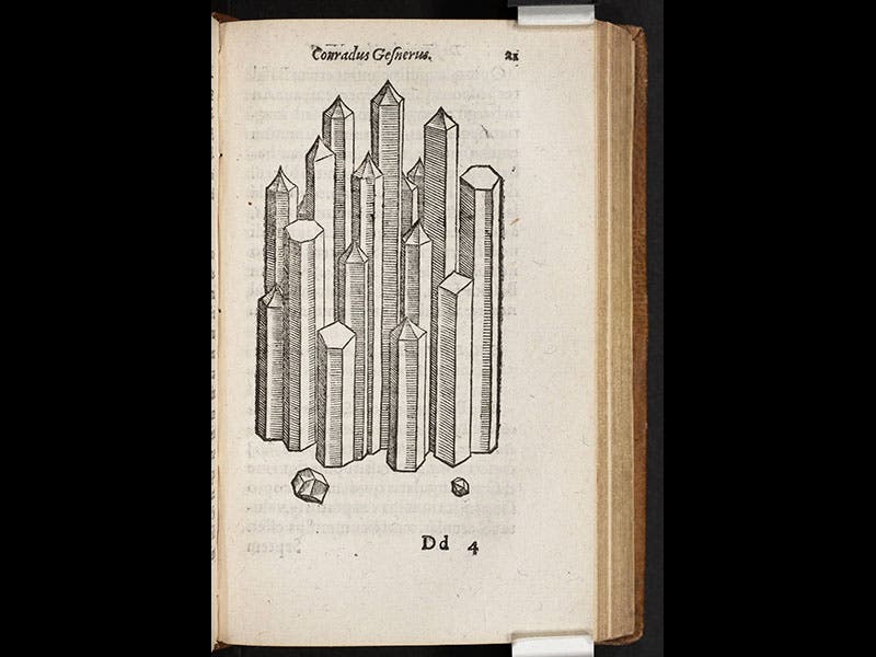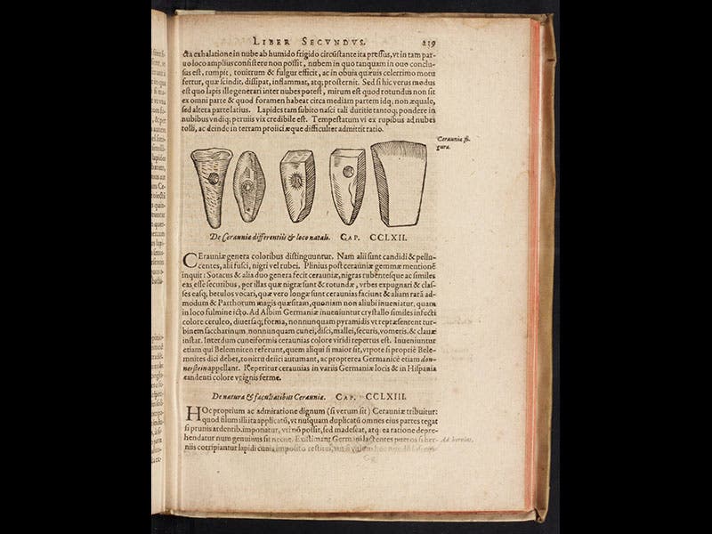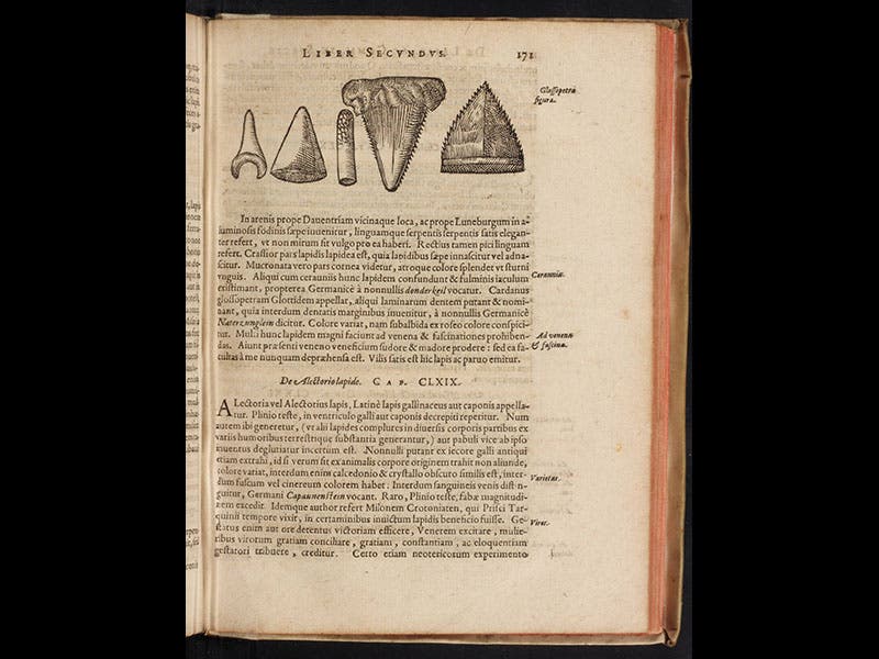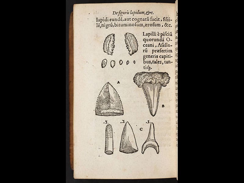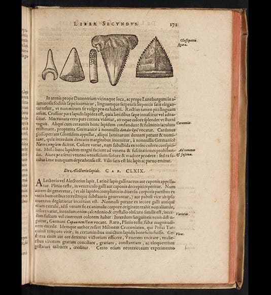 One might expect that the illustrations in a book about a specific collection would show the objects in that collection. The lesson for today is that this was rarely the case before the late 17th century. Rudolf II no doubt had a collection of tonguestones, and a piece of basalt. But de Boodt simply copied his images from those in Conrad Gesner's De omni rerum fossilium (On all kinds of fossil things), published in 1565. Gesner's tonguestones, and his basalt, are depicted above (fourth and fifth images). Such blatant borrowing of images was very common in museum books in the Renaissance and early modern period.
