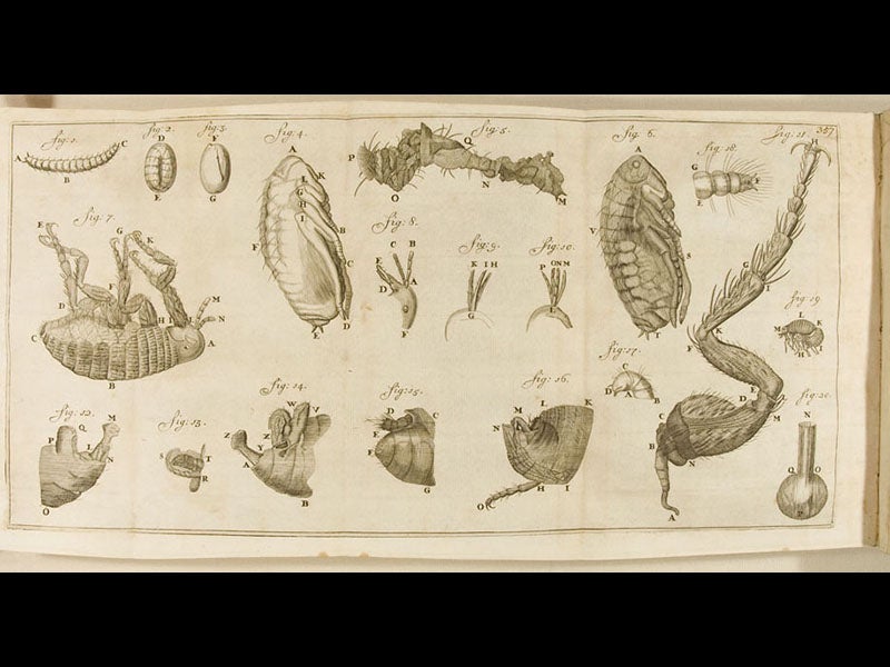 Leeuwenhoek's illustrations of bacteria and spermatozoa are important, but his drawings of fleas are more interesting (second image), because nearly everyone else who drew a flea made it look exactly like Hooke's flea; Leeuwenhoek was clearly his own man.