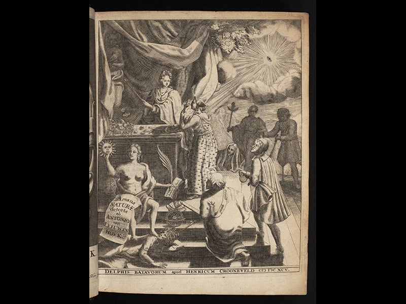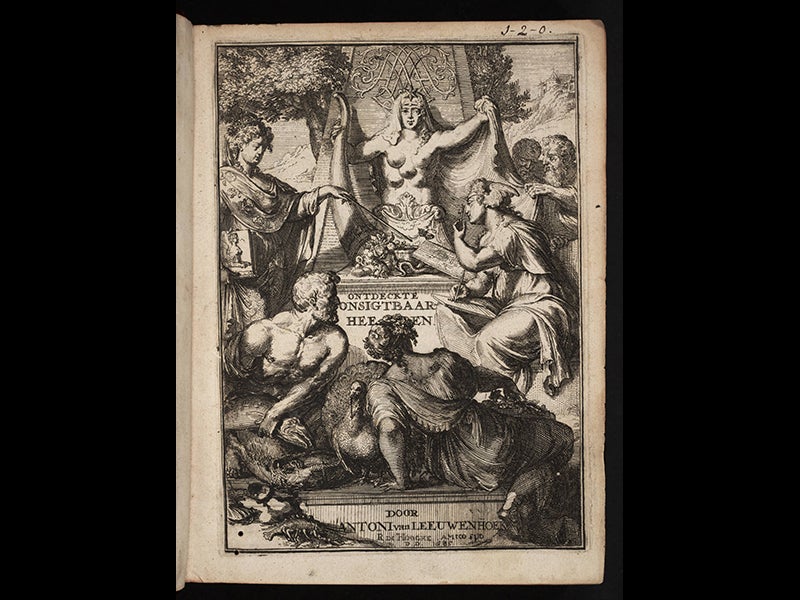 Because the tiny glass bead of a Leeuwenhoek microscope has a very short focal length, one has to hold the microscope very close to the eye for observation. Two of Leeuwenhoek’s book collections begin with allegorical frontispieces (third and fourth images), and in both of them, a personification we might call "Investigatio" is using a single-lens microscope to examine Nature (fifth image).