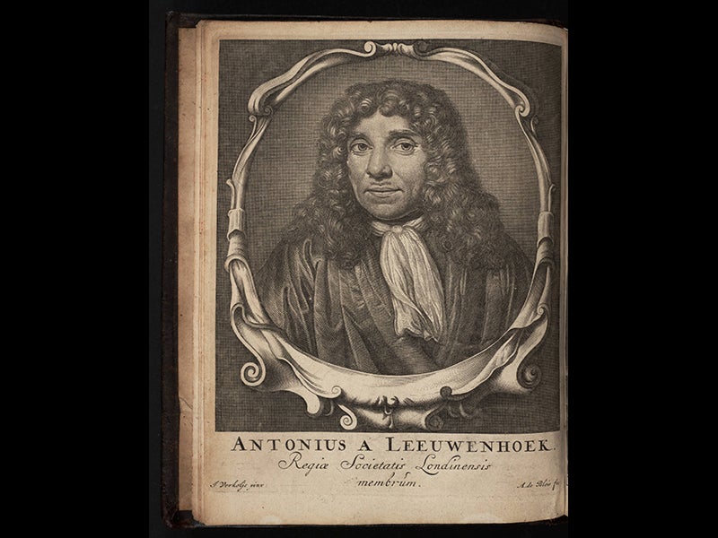 Antoni van Leeuwenhoek, a Dutch microscopist, was born Oct. 24, 1632, in Delft. Leeuwenhoek earned his living as a draper, an inspector of cloth, but in the 1660s he read Robert Hooke's celebrated Micrographia (1665), in which Hooke described a "simple" microscope, with one lens, before stating his preference for a multi-lens, or compound microscope. Leeuwenhoek had a go at making his own single-lens microscope, and he got so good at it that he never moved on. He looked at swamp water, blood, insects, tooth tartar, all manner of things, and sent his descriptions off to the Royal Society of London, which translated his Dutch letters into Latin or English and published them in their Philosophical Transactions for over 40 years, some 300 letters in all. At regular intervals, the letters were collected and published in both Dutch and Latin editions. We have a number of these editions in the Library, as well a several sets of the Philosophical Transactions, so we have Leeuwenhoek observations in abundance.