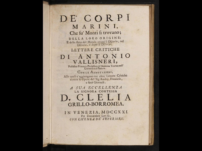 Antonio Vallisneri, an Italian geologist and naturalist, was born May 3, 1661. In 1695, the English geologist John Woodward wrote a book, An Essay toward a Natural History of the Earth, in which he argued that, during the Great Noachian Flood, the entire crust of the earth had been dissolved, allowing animals and plants to descend through the muck and take up new places as fossils. Vallisneri, a professor of medicine at Padua, was an early critic of Woodward, both in reviews of Woodward’s book, and in his own later book on fossils, De corpi marini (On marine bodies, 1721). Vallisneri found it a bit extreme to think that God would use such a world-wrenching device just to punish wicked mankind, when he could do the same thing with a much smaller force. He thought the Flood was probably a local phenomenon (after all, humankind was confined to the Near East at the time), and he believed that fossils required an entirely different explanation. Accounting for fossils still required water and sediment, but probably much more time than the Flood provided. For Vallisneri, the Biblical Flood was miraculous, it did what God wanted it to do, and it had nothing to do with fossils, or any other aspect of the natural world. Vallisneri's general view was that trying to use Scripture to explain Nature is detrimental both to religion and to science.