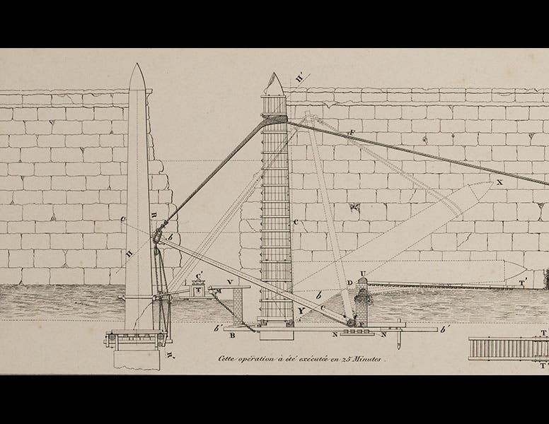 Jean-Baptiste Apollinaire Lebas, a French engineer, was born Aug. 13, 1797. In 1819, the Vice-Consul of Egypt gave an obelisk standing in Alexandria to France (it was one of a pair, the other going to England), but the French wanted a grander monolith, so they lobbied for one of the large obelisks up the Nile, at the temple of Luxor in Thebes. Napoleon’s savants had recorded it during the invasion of Egypt, 1798-1801 (second image; the obelisk that was given to France is the one on the right.)