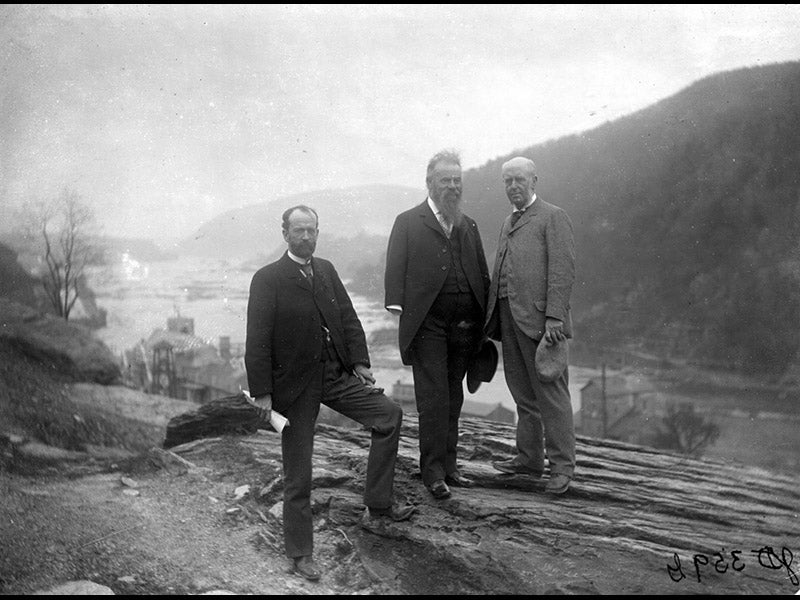 Geikie also had a keen interest in the history of geology, and in 1897 he delivered a series of lectures at Johns Hopkins University that were published immediately in a volume titled The Founders of Geology. It is not great history, but it is intellectually exciting, and the book has never been out of print. While in the United States for the Hopkins lectures, Geikie went on a field trip, and he posed for a photograph with Charles Doolittle Walcott and John Wesley Powell, two of the most eminent American geologists (second image; Geikie is on the right, the one-armed Powell in the center). Such historic photographs that bridge the Atlantic are all too infrequent; one is reminded of the photograph of Ernest Rutherford, Bertram Boltwood, and Otto Hahn that froze in time the accomplished physicists from England, the United States, and Germany; we reproduced it when we featured Boltwood as our Scientist of the Day earlier this year (second image at that site).