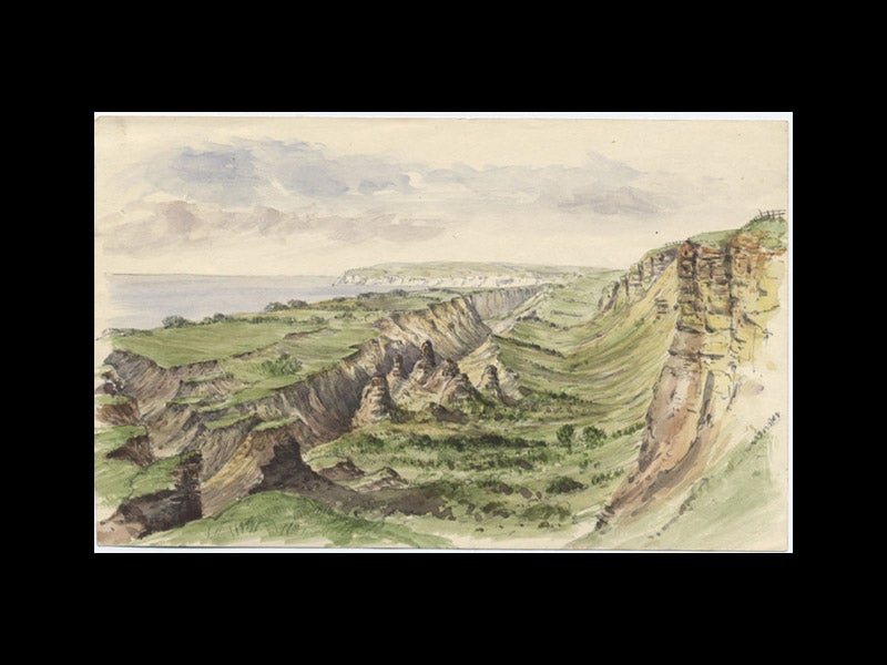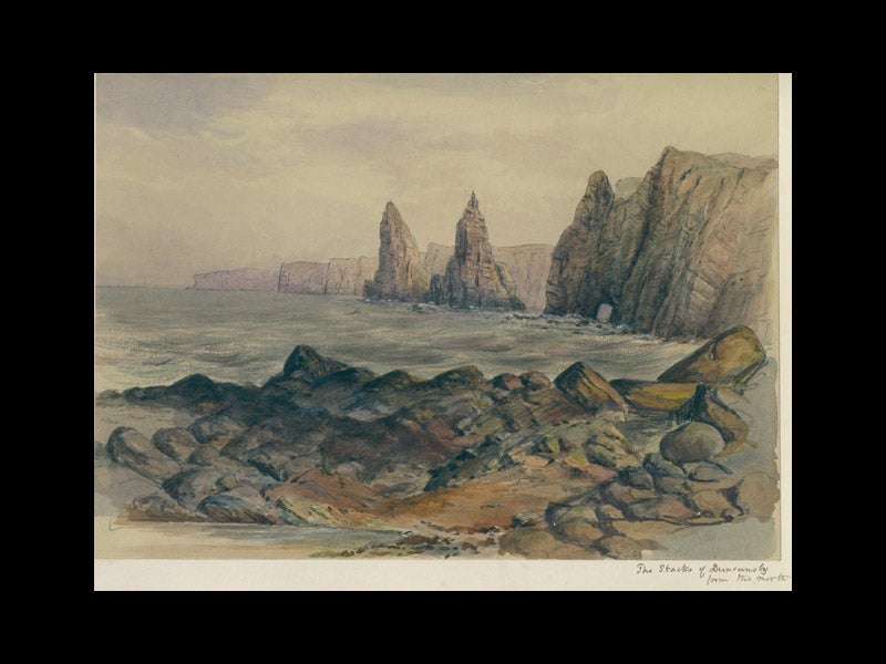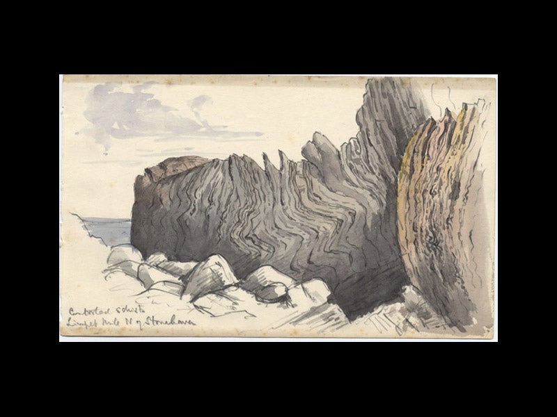 Geikie was an accomplished landscape artist; over 700 of his watercolors are preserved in the Haslemere Educational Museum in Surrey. We have illustrated today’s account with four of those sketches. The first image shows the famous Axmouth landslip in Devon, and the third image illustrates the Stacks of Duncansby, the northernmost part of Scotland. The portrait (sixth image) shows Geikie in 1913, and is in the Royal Scottish Geographical Society in Perth.