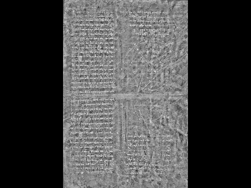 On Oct. 29, 1998, the gavel came down at the auction of an ugly-looking medieval manuscript (first image above). Splotched with mildew, displaying a Greek prayer book of no special interest, the codex appeared to have little going for it except its age, which was 13th century. But one important feature had brought bidders from around the globe and on the phone to Christie’s in New York: the manuscript was a palimpsest, which means the parchment had been scraped and reused, and there was another text, several centuries older and only faintly visible, lying under the prayer text. That "other text" proved to be a collection of seven of the works of Archimedes, in Greek, including a treatise, "The Method," for which no other copy exists.
