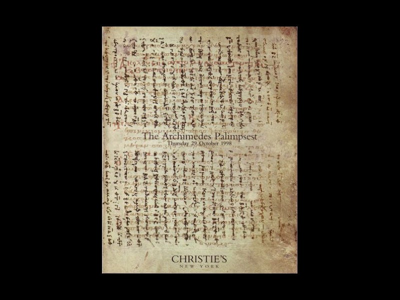 The Archimedes palimpsest first came to light in 1906, when Johan Heiberg, a scholar of ancient Greek mathematics, had examined it in Constantinople and recognized the underlying script as Archimedean. The manuscript subsequently turned up in the library of a French collector, then disappeared for 75 years, and then emerged again in 1998, when Christie’s offered it up at auction (second image). When the gavel dropped, the winning bid was an even $2 million (with another $200,000 in premiums added on top). The buyer remains anonymous (although it is a not-very-well-kept secret in the rare book world), but the new owner immediately consigned the palimpsest to the Walters Art Museum in Baltimore, where a large team of scholars, armed with state-of-the-art digital photographic equipment and sophisticated analytic software, have been teasing out the hidden text for about 15 years now (third image, where the underlying Archimedes text now stands out). It has been called the most advanced imaging project in the world, and there have been several popular books on the project written by the investigators. The Walters has placed a number of short informative videos concerning the palimpsest on Vimeo, including one that quickly leafs through part of the manuscript.