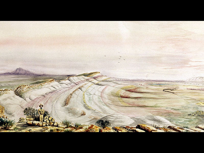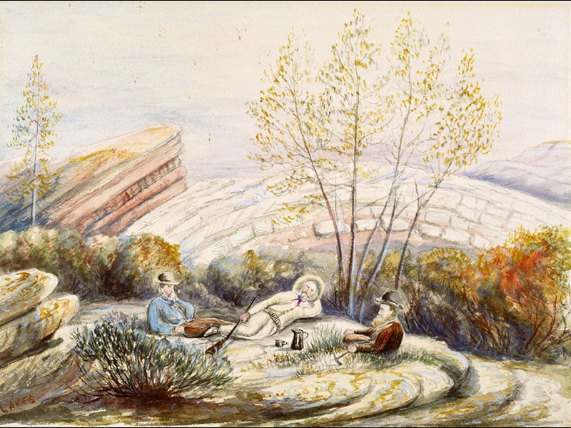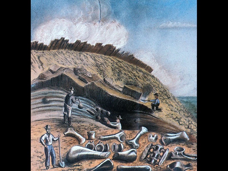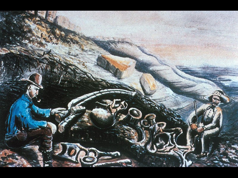 But Lakes’ greatest contribution to the history of Western paleontological exploration may have been his sketches and paintings of the activities of the bone hunters in action. Lakes was not much of an artist, but he was the only one who made visual records of the goings-on at Morrison and Como Bluff in Wyoming, so his watercolors are invaluable historical resources, and they have a great deal of naive charm as well. We see five of them above. Note the care with which the geological strata are depicted. Lakes’ original watercolors are at the Peabody Museum of Natural History at Yale University, New Haven, Connecticut.
