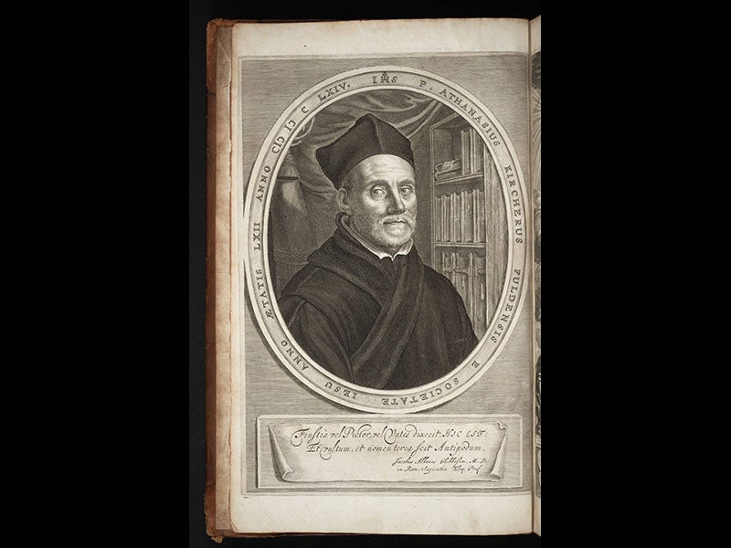 Athanasius Kircher, a German scholar working mostly in Rome, was born May 2, in 1601 or 1602. Kircher was a Jesuit, and like many of his order, prone to writing large books. Kircher, however, outdid them all, publishing some 40 folio volumes on subjects ranging from geology, astronomy, and magnetism to Egyptian antiquities, China, and Noah’s flood. Kircher wrote at a time, the 1650s and 1660s, when much of the scientific world was in the throes of a scientific revolution, led by Johannes Kepler, Galileo Galilei, and René Descartes. Kircher, however, was still immersed in the Renaissance world of Aristotelian physics and Hermetic magic. He continued to see emblematic meanings and arcane symbolism everywhere he looked in the world, and he rejected the mechanical philosophy of the Cartesians, which stripped the world of magical forces, correspondences, and sympathies.
