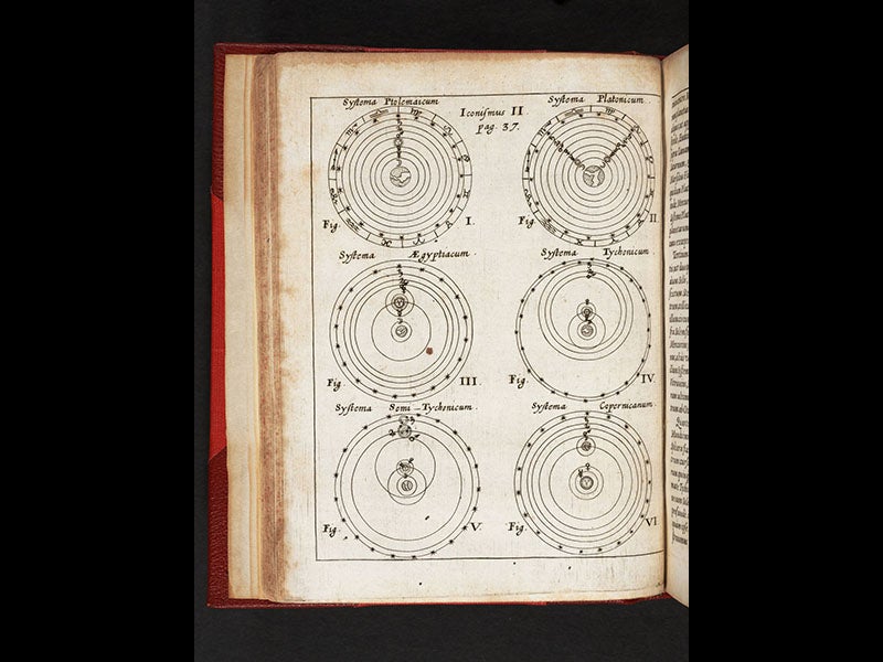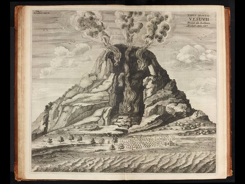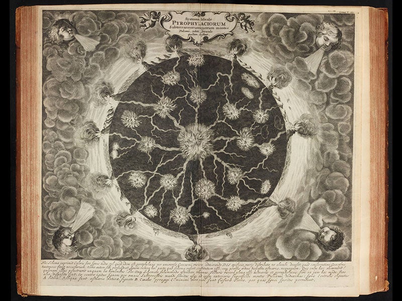 Nevertheless, Kircher played an important role in disseminating recent scientific work, and his books are quite beautiful (the Society of Jesus had plenty of money to pay engravers) and well worth perusing. We have 29 Kircher titles in the History of Science Collection, most of them large folios, and we have displayed a number of these in exhibitions over the years. The images above, culled from various of his works, show, in order, a sunflower clock from Magnes sive De arte magnetica (1641); his portrait, a section of the earth, and a section of an erupting Vesuvius, all from Mundus Subterraneus (1665); a collection of six possible cosmologies, from Iter extaticum coeleste (1660); and the engraved title page from his work on optics, Ars magna lucis (1646). Nearly all of Kircher’s books carry allegorical or emblematic title pages, and you can see all of these in our Digital Collection called “Emblematic Science."