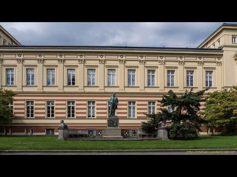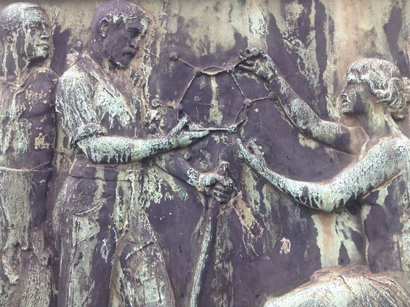 There is a handsome bronze statue of Kekulé in Bonn (second image); no tail-biting snake is in evidence, but there is a stool, which is perhaps intended to represent the site of the daydream. On the plinth below the statue (third image), there is a small relief, on which Nature, at the right, is handing a benzene ring, with its bent double-bonds, to Techne, essentially saying, “Here, make it work.” And if one looks in a wider view (fourth image) at the stone supports that hold up the walls on either side of the statue, you can make out their hexagonal core and 6 radiating spokes. There was nothing obvious about Hans Everding, the sculptor, if he designed the walls as well as the statue.