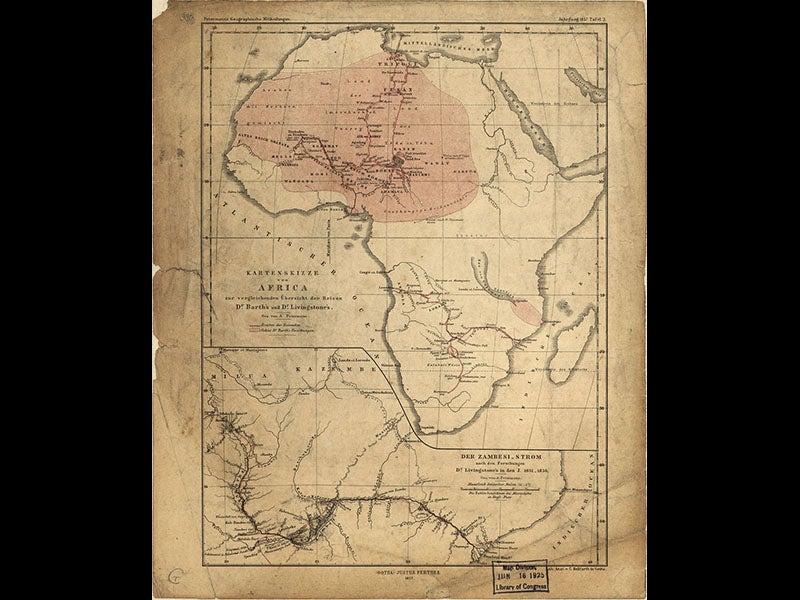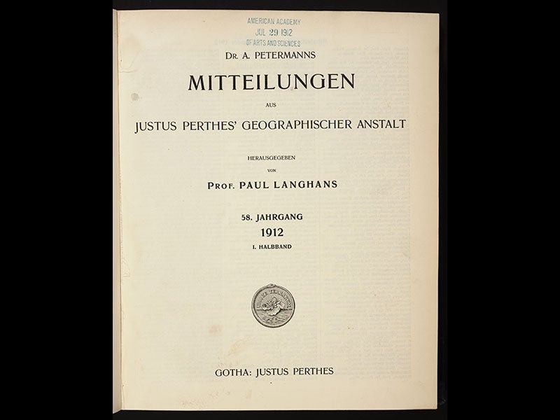 Peterman became a member of the Royal Geographical Society and was particularly interested in promoting expeditions’ to Africa, and he published one of the first accurate maps of central Africa in 1857, following the expeditions of Heinrich Barth and David Livingstone (detail, third image). But then Peterman returned to Gotha in central Germany and took over the geographical institute that had been set up there by the publisher Justus Perthes. Soon Petermann was editing and publishing his own geographical journal, Petermanns geographische Mittelungen (founded in 1855), which would rapidly become the most respected cartographic journal in the world. The journal was published up until 2004; we have a long run in the Library, but it only goes back to 1879, so we are missing the first 24 years, the volumes that Petermann edited. One volume we do have is volume 63, published in 1912 (fourth image), containing Alfred Wegener's first papers proposing the idea of continental drift (fifth image).