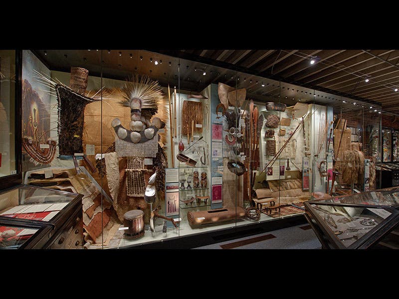 Pitt-Rivers did a great deal of excavation himself in England and Ireland, but he also bought objects from all over the world on the antiquities market. By 1884, his collection amounted to 18,000 items, and in that year he gave everything to Oxford University, with the proviso that they add a wing to the Oxford Museum to house the collection, and Oxford was happy to do so. The Pitt Rivers Museum still flourishes, and they have kept the objects in the typological arrangement advocated by Pitt Rivers, which gives it quite a different look from most museums. We see above not only a wide view of the museum interior (second image), but one of the wall cases (first image), and an Egyptian model funerary boat that was acquired by Pitt Rivers in 1879 (third image).