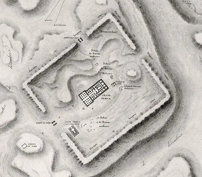 They began with Dendera and made a complete topographic survey of the area. They then constructed careful elevation drawings, and finally, they attempted with their pencils to restore the monuments to their former glory. The expedition moved south and encountered, just as Denon had, the magnificance of Thebes, Edfu, and Philae. Working through the summer of 1799, Jollois, Devilliers, and other engineers, architects, and artists filled their notebooks with groundplans, elevations, restorations, and details of the wall carvings and hieroglyphics.