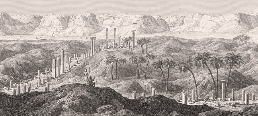 The Commission made a careful survey of Antinoë, which was built by the Emperor Hadrian in memory of Antinous, who drowned himself on this spot. One of the engineers holds a surveyor’s rod, which was used to measure off distances. Image source: Napoleon I, (Edme-François) Jomard, and Jean-Baptiste-Joseph Fourier. Description de l’Egypte: ou, Recueil des observations et des recherches qui ont été faites en Egypte pendant l’expédition de l’armee Française. Antiquités planches, vol. 4, A Paris: De L’Imprimerie impériale, 1809-1828, pl. 54.