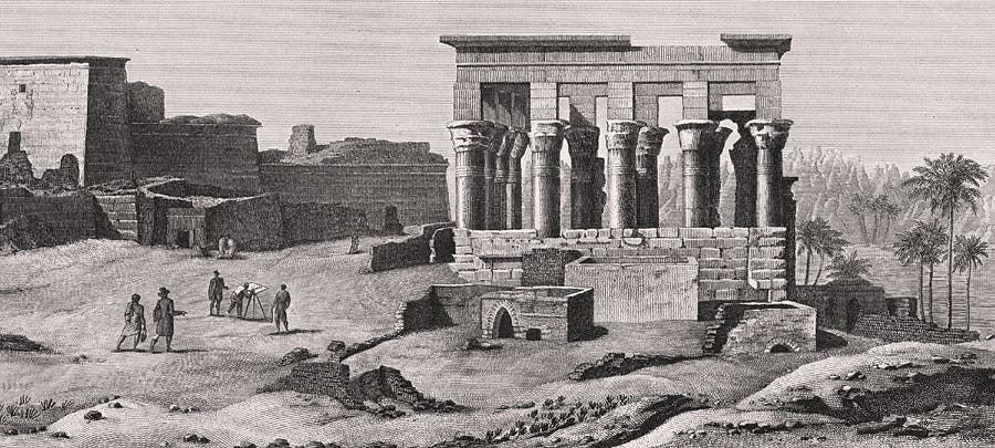 The engineers and artists of the Commission of Sciences and Arts appear frequently in the views of antiquities that were published in the Description de l'Égypte. In this detail from a much wider view, several artists can be seen, leaning over their sketching tables, drawing the Kiosk of Trajan on the isle of Philae. Vivant Denon so loved this monument that he wanted to take it back to France. Image source: Napoleon I, (Edme-François) Jomard, and Jean-Baptiste-Joseph Fourier. Description de l’Egypte: ou, Recueil des observations et des recherches qui ont été faites en Egypte pendant l’expédition de l’armee Française. Antiquités planches, vol. 1, A Paris: De L’Imprimerie impériale, 1809-1828, pl. 25.