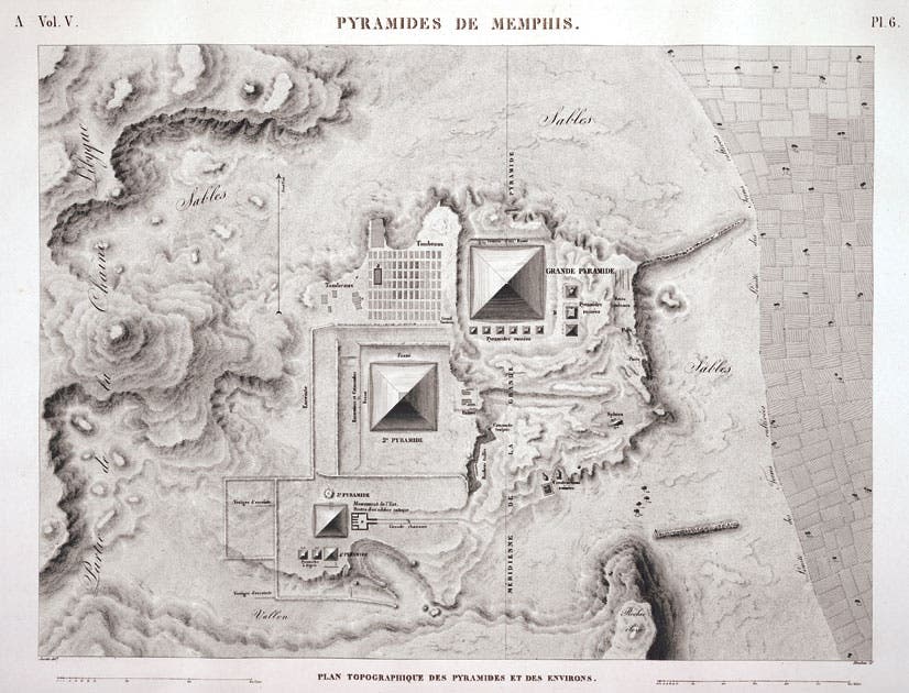 The French engineers carefully mapped the layout of the Giza complex. The Great, or “Grande” Pyramid is not only the largest but also the closest to Cairo. The Second and Third Pyramids are each successively more distant. The Great Sphinx was half buried in the sand and is located in the causeway that leads to the Second Pyramid. Image source: Napoleon I, (Edme-François) Jomard, and Jean-Baptiste-Joseph Fourier. Description de l’Egypte: ou, Recueil des observations et des recherches qui ont été faites en Egypte pendant l’expédition de l’armee Française. Antiquités planches, vol. 5, A Paris: De L’Imprimerie impériale, 1809-1828, pl. 6.