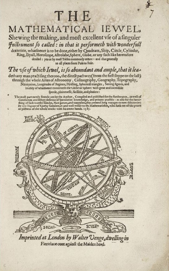 John Blagrave’s 1585 book, The Mathematical Jewel described a new type of astrolabe with a variety of navigational and astronomical applications.