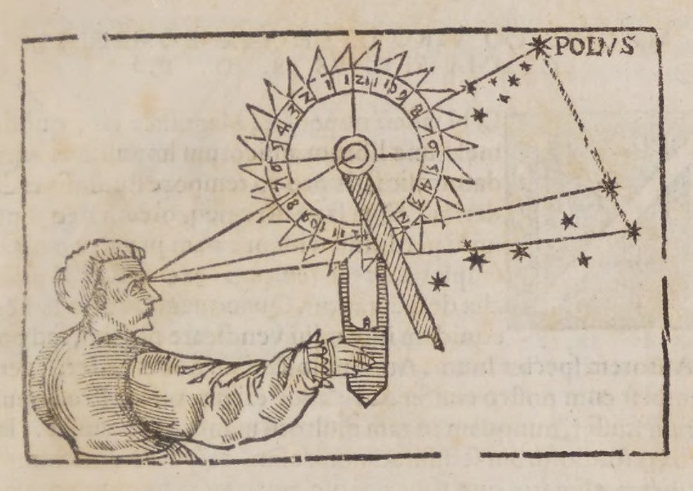 “Nocturnal dials” or “night dials” are astronomical instruments used to tell the time at night with the aid of fixed stars like the Great Bear. Since each star completes one revolution around the Pole Star within a day, each star could be regarded as an hour-hand in a clock. In The Arte of Nauigation (1589), Martín Córtes refers to the “nocturnal dial” as a “an instrument generall for the houres of the nyght.” Córtes was a Spanish cosmographer whose career was inspired by growing up in a family of sailors, seafarers, and navigators. In his work, he states that after calibrating a dial, it could be used at night: